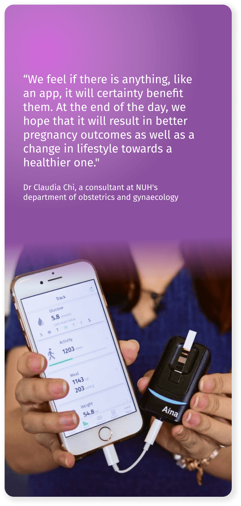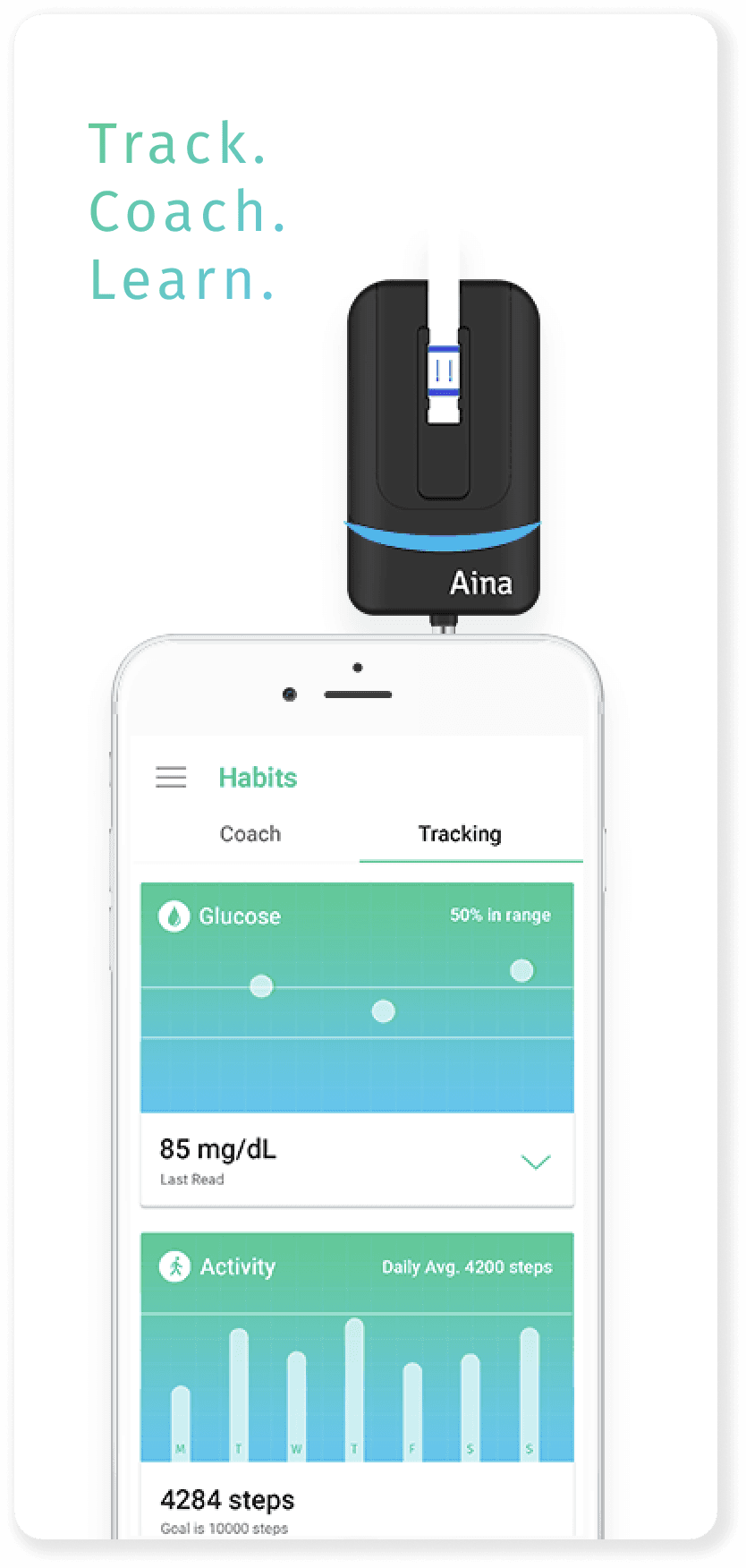 The app works with the connected Aina meter to seamlessly capture crucial real-world data: glucose levels, diet, weight and physical activity.